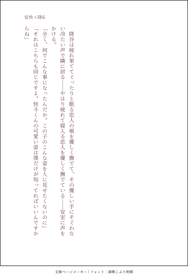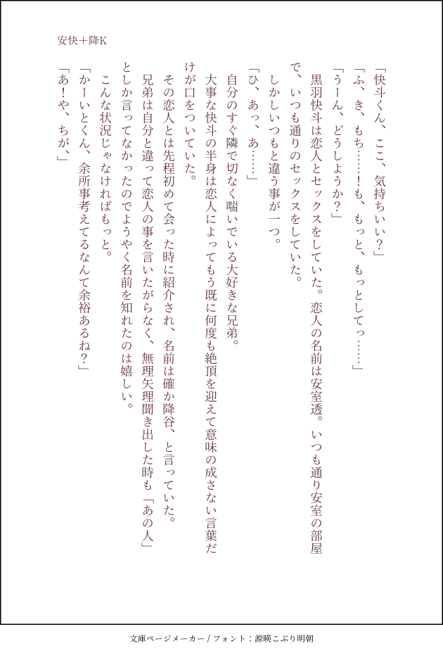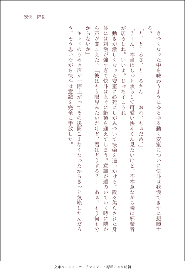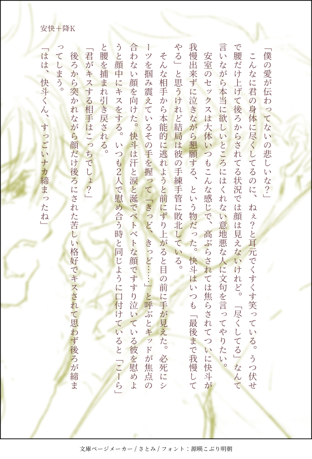 安快+降快※文です※R18です 妄想小ネタ 2019年05月16日 ついったーの裏アカウントでアップしたやつです。 ついったの方ではメモ書きだったんだけど、文庫ページメーカーさん使ったらすごいいい感じになったのでこちらにもあげてしまいます(笑) 注意!!!!! キッドちゃんと快斗くんの分裂双子設定。 降谷さんも降谷さんと安室さんで分裂してます。 安快と降Kですが、快斗くんメインで進むので、ほぼ安快。 完全にR18内容なので、18歳以上の方のみ下の「18歳以上です。」からお入りください。 昔から自分の中では、2面性のあるキャラの分裂が無かったんですが、ふと、キッドちゃんと快斗くんが分裂してそれぞれの相手が降谷さんと安室さんで、えっちしてる最中に快とKで手つないでたりしたら可愛いな!?って思った結果のブツです。 なので完全に特殊設定でしかもほぼやってるだけ的な… ただただ、快+K双子のえろが見たいだけなんだ…… というわけでOKなお方はどうぞ! 「二度とありませんよ」 とか言わせながら、「はたしてそうかな?」と突っ込む自分も居る(笑) PR