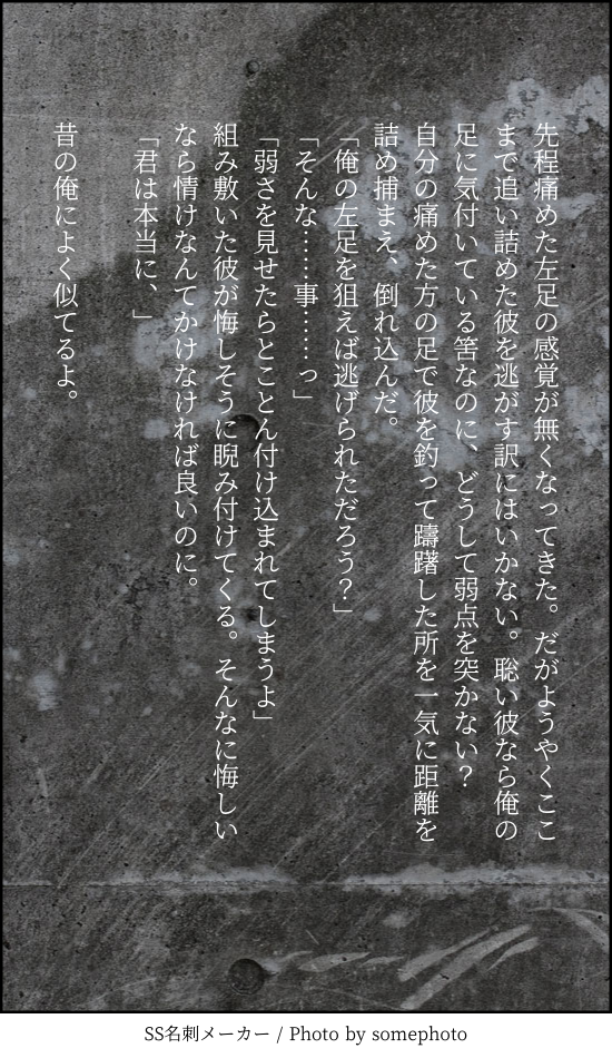 とことん快くん(Kちゃん)至上なので快くんは常に上(物理的にも精神的にも)に居て欲しい。降さんはそんな快くんを自分のステージまで引きずり落としたい。降さんが快くんを掴まえるより快くんが降さんに「ったく、しゃーねーから掴まってやるよ!」ってなる方が好き。
