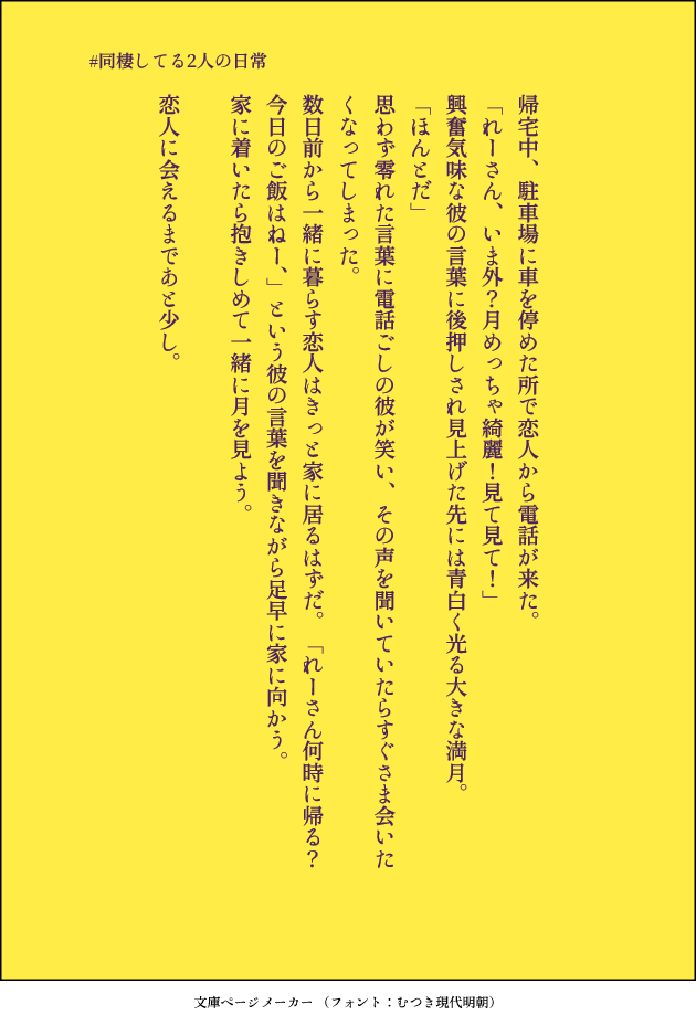 診断メーカーさんネタ18「秋の降快」 妄想小ネタ 2019年03月07日 秋の降谷さんと快斗くん:帰り道、相手から「月が綺麗だから見て!」と電話がかかってきた #同棲してる2人の日常 https://shindanmaker.com/719224(新しいウィンドウが開きます) そして月を見たら会いたくなる(^ω^) 同棲っていいな! っていう話(笑) 文庫ページメーカーさん、お借りしました!(*´˘`*)♡(新しいウィンドウが開きます)