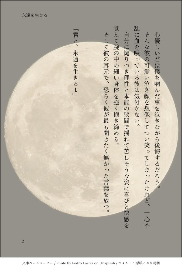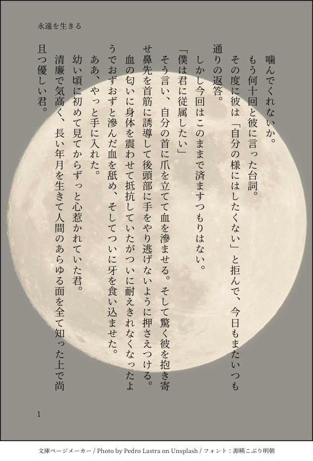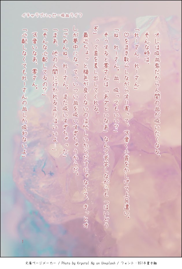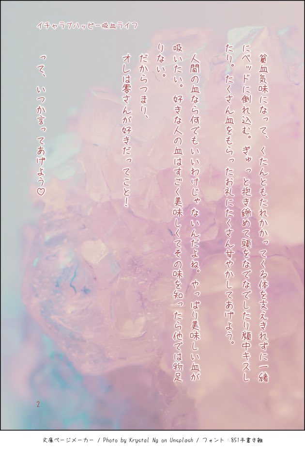 人間降谷さんx吸血鬼快斗くん2※パロです。ご注意ください 妄想小ネタ 2019年03月14日 次郎さんがめっっっちゃ可愛い小悪魔吸血鬼快斗くんを投下してくれたので深夜テンションでやってしまった。後悔はしていない…( - ̀ω -́ )✧ 人間降谷さんx吸血鬼快斗くんの降快小話。前にあげたのとはまるっきり別物。 ずっとかいとくんのターン! 今回も文庫ページメーカーさんお借りしてます(*´ω`*)♡(新しいウィンドウが開きます) ※イチャイチャ ※快斗くんが小悪魔あざとい ♡乱舞させて「零さん零さん!血吸っていい?」って懐いて「ごめーん!吸いすぎちゃった(´∀`*)てへぺろ」ってやる快斗くんと「だ、大丈夫…」ってなる優しい降谷さんのお話でした。 とりあえず、いつかじゃなくて今言ってあげて!!!ってなりますね(笑) 次郎さーーん!!!素敵ネタの投下ありがとうございました!♡