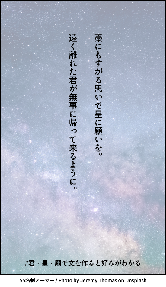 #君・星・願で文を作ると好みがわかる 妄想小ネタ 2019年03月23日 ツイッターにて「#君・星・願で文を作ると好みがわかる」というタグを見つけたので書いてみました! ただ何となく『快斗さんを心配する降谷さん』で書いたけど、映画情報見た今では本当に遠くシンガポールに行った子を心配してる人になりましたね(笑) そんな彼はボロボロになって帰ってきちゃうわけですが;; SS名刺メーカーさんをお借りしました(*´ω`*) PR
