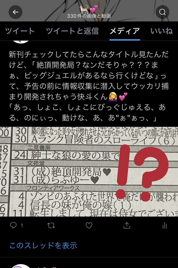 ぜっちょーかいはつきょく♡ 絵 2022年05月02日 今日はお休みだったのでワンドロまとめ本に手をつけようと思ったけど表紙がなかなか出来なくて全然進められなかった・・・無念(T_T) ところで、Twitterの表示が! 表やbotなどの表示は変わってないのに裏垢だけ表示が変わって・・・?なぜ・・・ (分かりにくいですが、他垢はアイコンの下には文字や画像が入らないけど、ここでは文字も画像もアイコンの下まで入ってます) そしてなぜこの画像を選んだのか私。 ネタが酷いので一応畳んでおきますね 『このスレッドを表示』で分かって頂けそうですが、続いてましたw でもかいとくん可哀相で・・・ きっと私しか喜ばない・・・ でも絶頂開発局とかめちゃくちゃ良いですよね PR