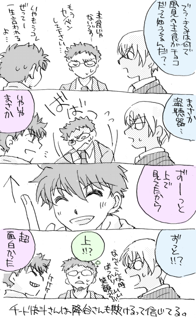 ぜろてぃー3話 絵 2018年07月05日 「風見さん!チョコで空腹紛らわせたって?ちゃんと食べて!チョコはメシじゃないんだぜ!?」 「黒羽君・・・面目ない」 「チョコは飲み物だよな!」 そして降谷さんに「快斗くん、君はちょっと黙ってようか」って言われるw風見さんに「快斗くん」って呼ばせるのもときめくけど「風見、お前は黒羽くんと呼べ。名前で呼ぶな」って(私の中の)降谷さんが止めるんだwww独占欲の塊な降谷さん好きー(*´◒`*) で、降谷さんが運転席座るの見て「ちょま、降谷さんが運転かよ⁉︎風見さん具合悪そうなのにあの運転手で大丈夫か⁉︎」って余計な心配する快斗くんまで妄想した(*´꒳`*) ぜろてぃー読んで、お仕事中の2人の近くのビルの屋上で某缶コーヒーのCM的に「お疲れ様」って微笑む快斗くん妄想した( *´艸`) 「風見さん良い部下で良かったなー、降谷さん」と微笑ましく思いながら「でも何か仲良すぎねぇ?」ってモヤッとする快斗くん可愛い(*´꒳`*) 例のCMのセリフが、 知ってるよ 人に気付かれないようにしてるけど、そこまでやるのって結構大変だよね ありがとう お疲れ様 なんですよ! これは…良いな(*´◒`*) PR