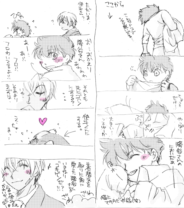 彼シャツ快斗 絵 2018年07月03日 家主の居ない時にお家の掃除とか洗濯とかもろもろしてたりする通い妻的な快斗さん(笑) 降谷さんの脱ぎ散らかしてったシャツをウッカリ着ちゃったよ! そしたらこうなるよね!(笑) そして仕事場でざわざわするんだね。 「降谷さんがツヤツヤ⁉︎」ってwww 『ま、まあ、降谷さんが機嫌いいと助かるけど、この人と付き合える女性が居たとは…』って風見さん辺りが思うんだけど、 風見さん残念!女性じゃないよ!w この3人がもしプライベートでバッタリ会ったら、 「奇遇だな(せっかく快斗くんと2人きりだったのに知り合いに会うとは面倒だな)(ポーカーフェイス中)」 「あ、は、はい・・・(誰だろう?降谷さんがあんな柔らかい表情してたということはかなり親密!!?降谷さんがたまに機嫌よくなってる時の感じに似てる、ということはまさかこの子が降谷さんの!!?)!!!??(ポーカーフェイス出来てない)」 「こんにちは(この人、降谷さんの部下の人だよな?何か挨拶した方がいいのか?いつも降谷さんがお世話になってます?イヤイヤイヤ、おれ別に嫁じゃねえし!)(ポーカーフェイスの下でめっさ困惑)」 嫁じゃねぇし!とか思ってる快斗くんのポジション完全にデキる嫁なんだけど全く違和感を感じない(*´◒`*) PR