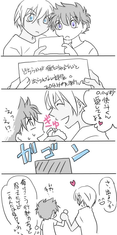 診断メーカーさんネタ 絵 2018年07月07日 降谷さんと快斗さんは『どちらかが愛を叫ばないと出られない部屋』に入ってしまいました。 20分以内に実行してください。 shindanmaker.com/525269 降谷さんがめっさ簡単に叫んでくれるw 秒で出れるwww 「あ、あい…してる、とか恥ずかしくないわけ⁉︎」 「恥ずかしい事なんて何一つないからね(キラキラ)」 「う!まぶし!!イケメンめ!」