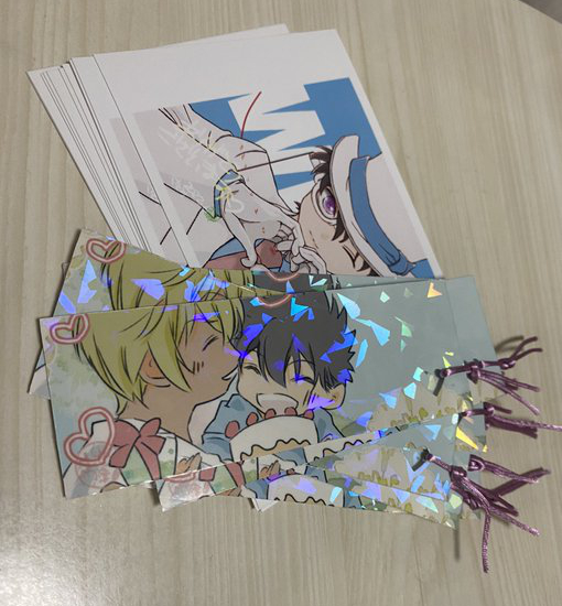 しおりはフォトペーパーにプリントして100均のホログラムシール貼ってパンチで穴開けて紐付けて…ってやったんだけど、ホログラムシール貼るの思ってた100倍難しかった…(不器用)
